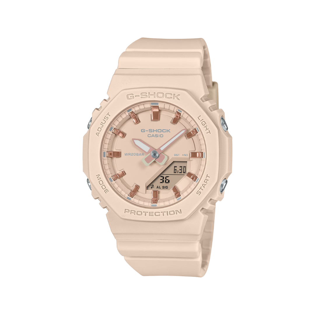 The GMA-P2100 features elegant indexes finished in pink gold vapor deposition and a compact design to fit smaller wrists with total comfort.