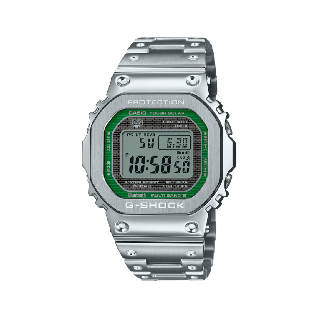 The GMW-B5000-3 inherits this legacy and carries it forward in an effortlessly refined full-metal G-SHOCK design with a silver gleam accented by an outline of fresh green.