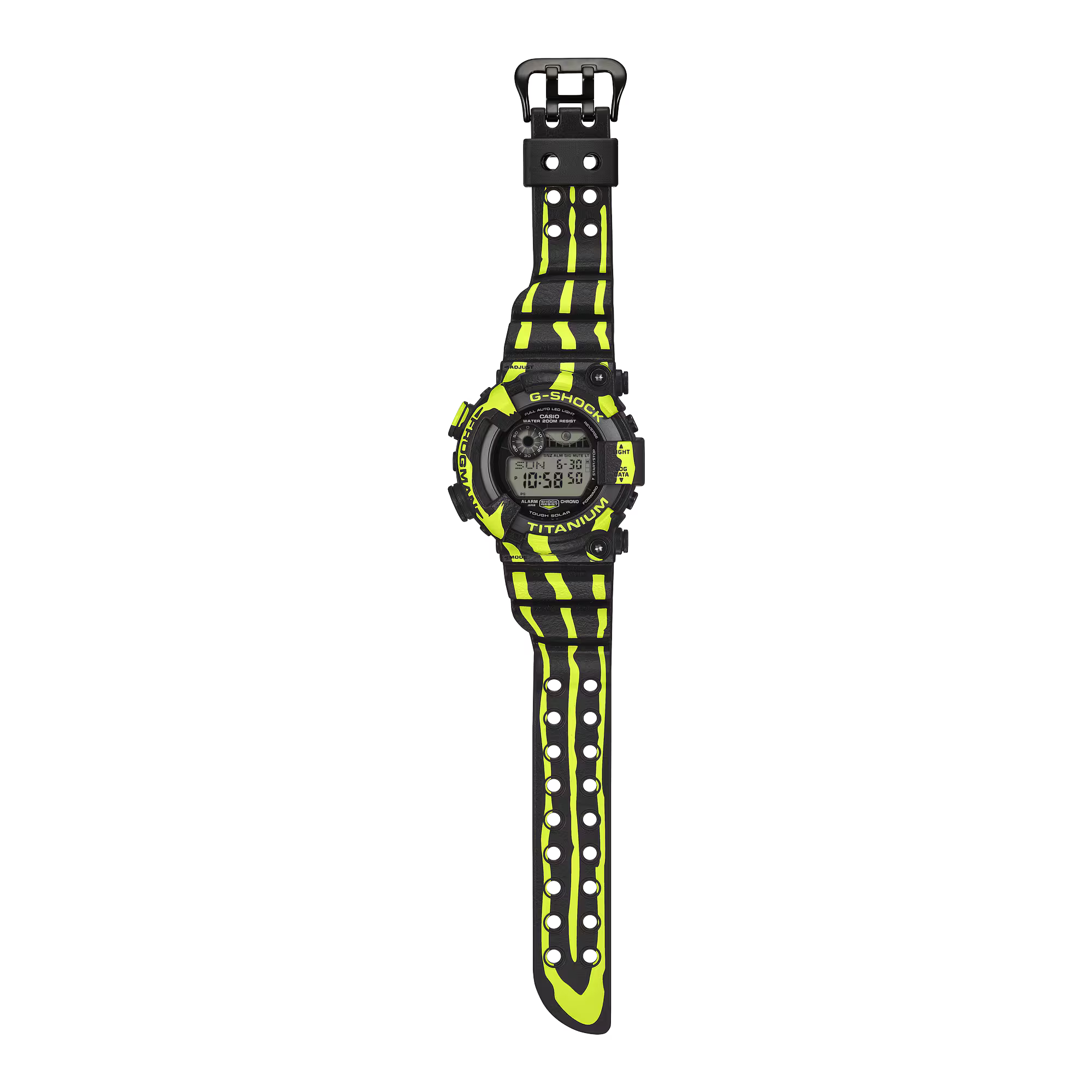 Bold vertical stripes in fluorescent green stand out against a black base for a striking, rugged look that showcases the dart frog’s intensity. The band and bezel are finished with a spray coating to evoke the texture of the frog’s skin. And the case back is, of course, engraved with the iconic diving frog character featured on every Frogman timepiece.