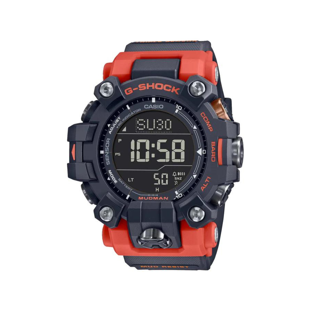 The G-SHOCK Master of G line of watches developed for professionals working in the harshest environments introduces the triple-sensor MUDMAN with mud-resist construction. The large, easy to operate front button and three direct sensor buttons on the side are shaped to drain mud and water and are protected by cylinder-shaped stainless steel components. The button shafts are equipped with gasket fittings to keep mud and dust out, as well, so you’re ready to take on the toughest of terrains.