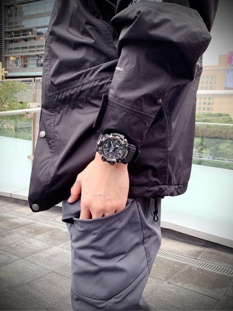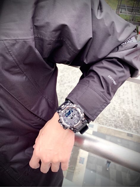 This compact design is made possible by the forged carbon bezel, carbon core guard case structure, and mud-resist buttons combined with stainless steel pipes and silicone buffers. Finely powdered carbon fiber is kneaded into resin, then heat-pressed to mold a bezel that is more complex, yet even stronger than before.