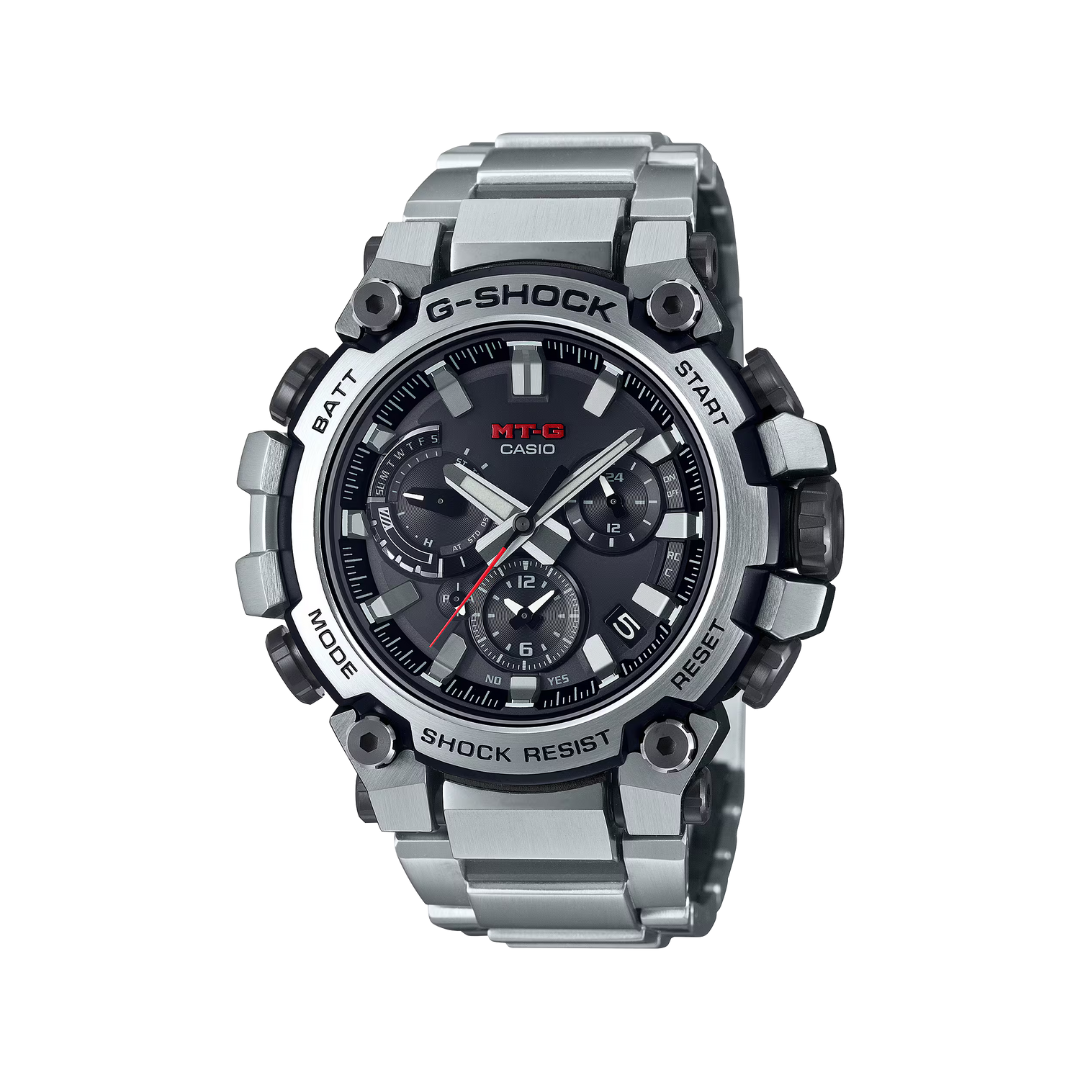 The MTG-B3000D features an even lighter layered composite band made of stainless steel and fine resin. Its stainless steel bezel is ion plated in black, then treated with a hairline finish to expose the stainless steel below the convex surfaces only. These meticulous details come together to offer an intricate and sophisticated design.
