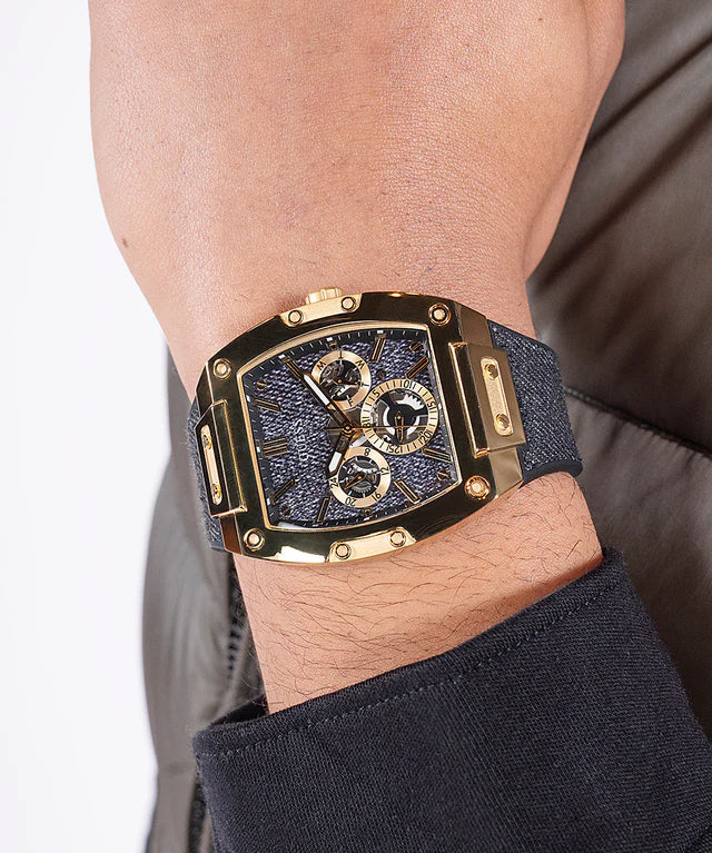Skeleton dial details keep this phoenix on the rise. Featuring a gold barrel shaped case with a black denim printed multi-function dial, this also features a FLEX strap. Soft black silicone is paired with black denim to create a flexible fit for every wrist.