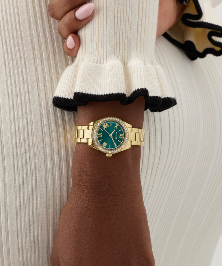This 30mm design brings a polished pop of color with its luminous palette and fresh, feminine edge. The polished gold tone case features a crystal embellished bezel that catch the light instantly, framing the teal sunray dial with a soft, radiant glow. Roman numeral markers add a touch of classic elegance.