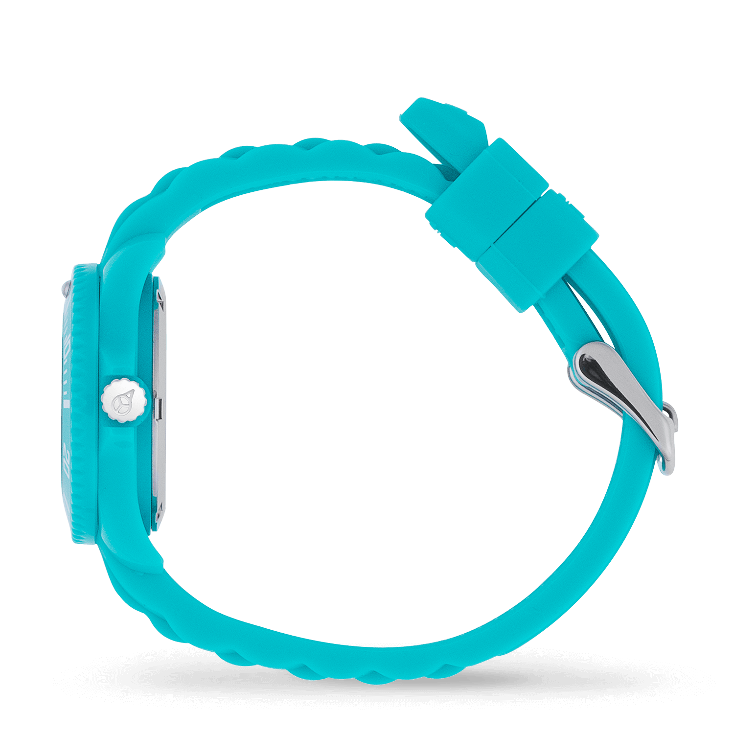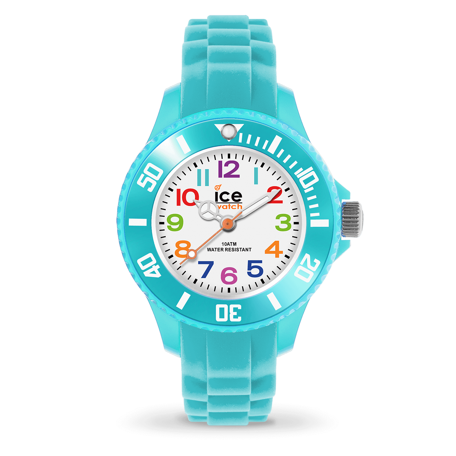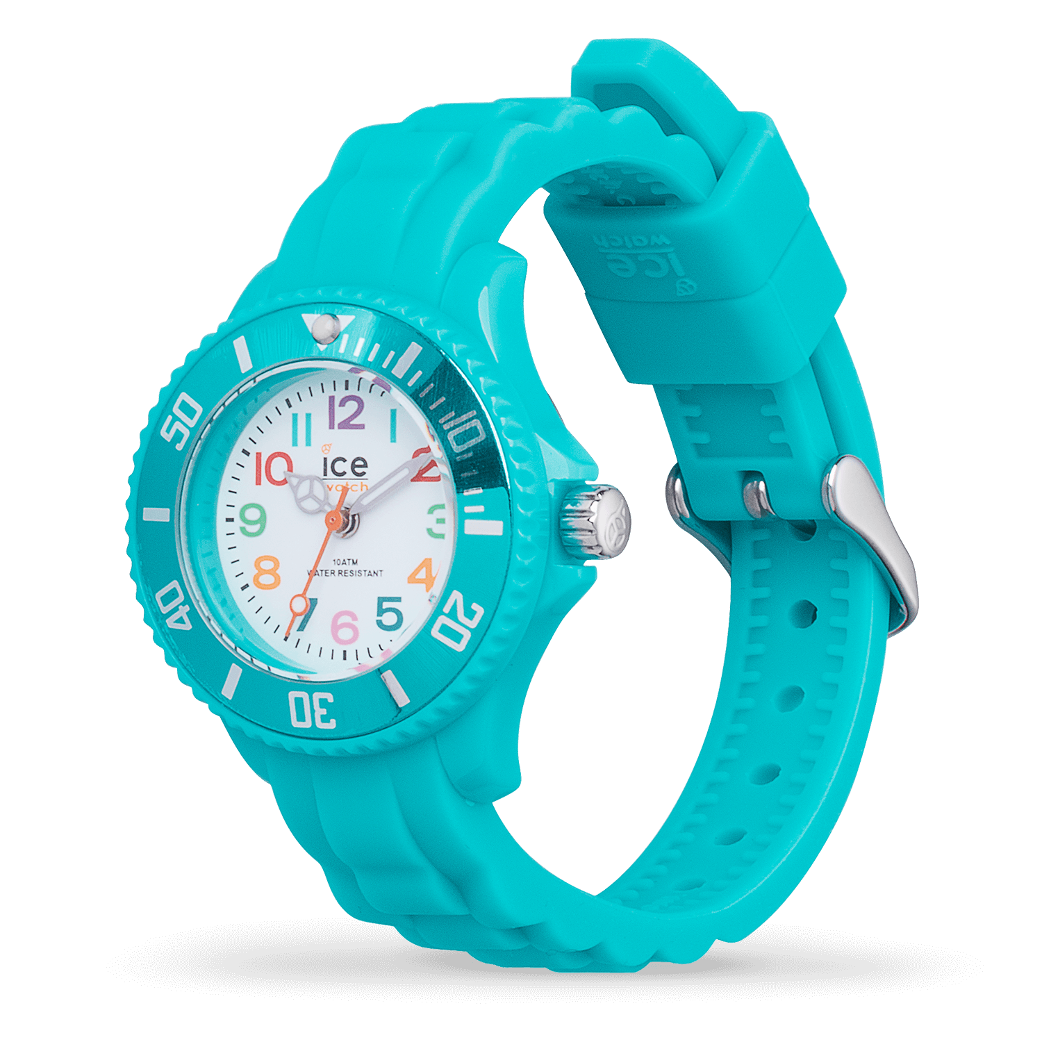 It is a turquoise silicone watch. With its small, white dial and its large, multicoloured numbers, learning to tell the time is child’s play. A perfect watch your children will love!