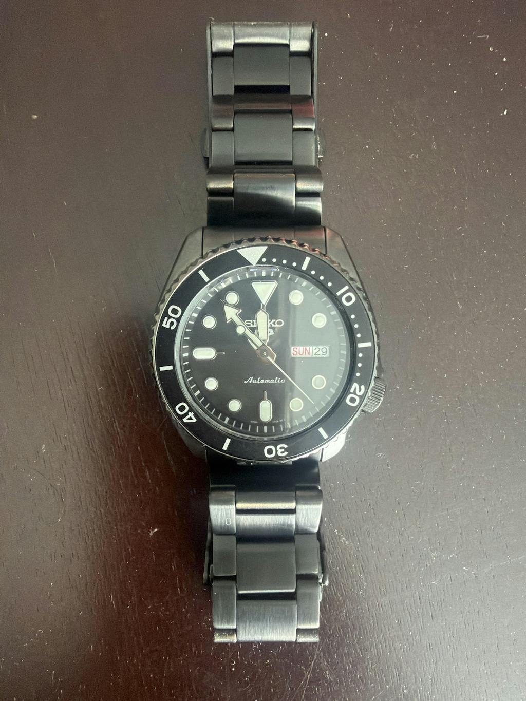 This Seiko 5 Sports Series timepiece features Automatic movement housed within a Stainless Steel casing and black dial with white details. Its strap is also crafted from Stainless Steel, providing a durable design with a case size of 42.5 mm. The watch is submergible up to 10 BAR.