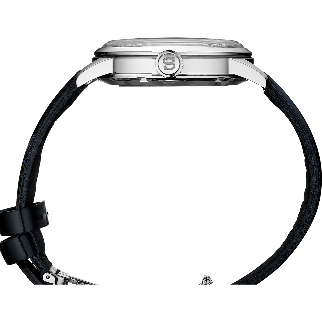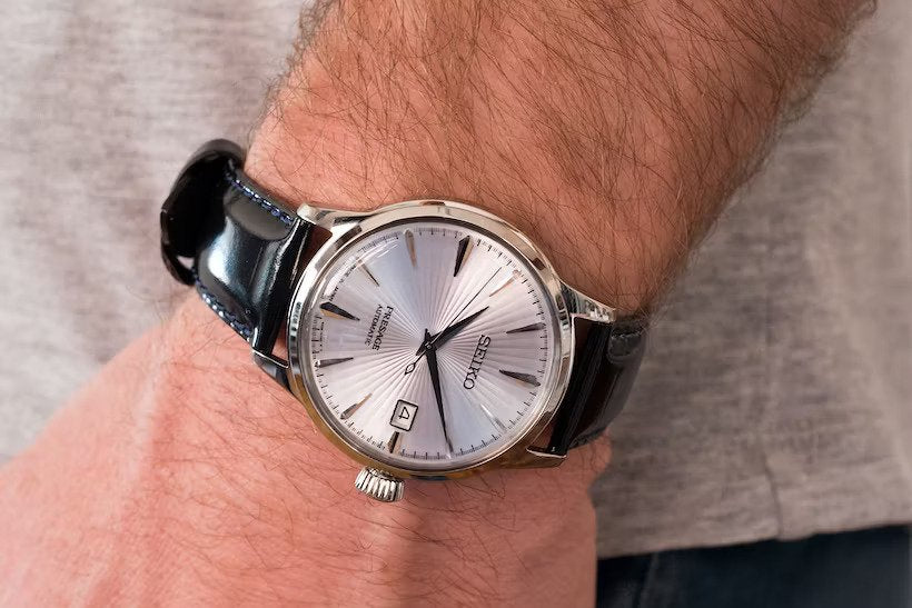 Seiko Presage Sky-Diving-Cocktail , featuring light grey/silver/ice blue sunburst dial, makes the watch to look anew at every different angle. The watch has spherical/ box-shaped hardlex crystal glass and see-thru caseback. Slightly bigger crown at 4mm to ease hand winding and time setting. Individually numbered on caseback. Case size 40.5 mm. Water resistance upto 50m.